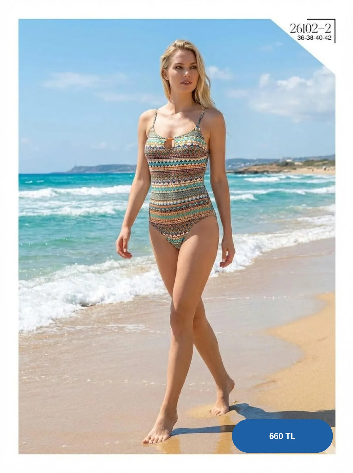 Şık göğüs penceresi ve yatay etnik çizgilerle tasarlanmış toptan kadın mayo. B2B portalımızda en uygun toptan fiyatlarla.
