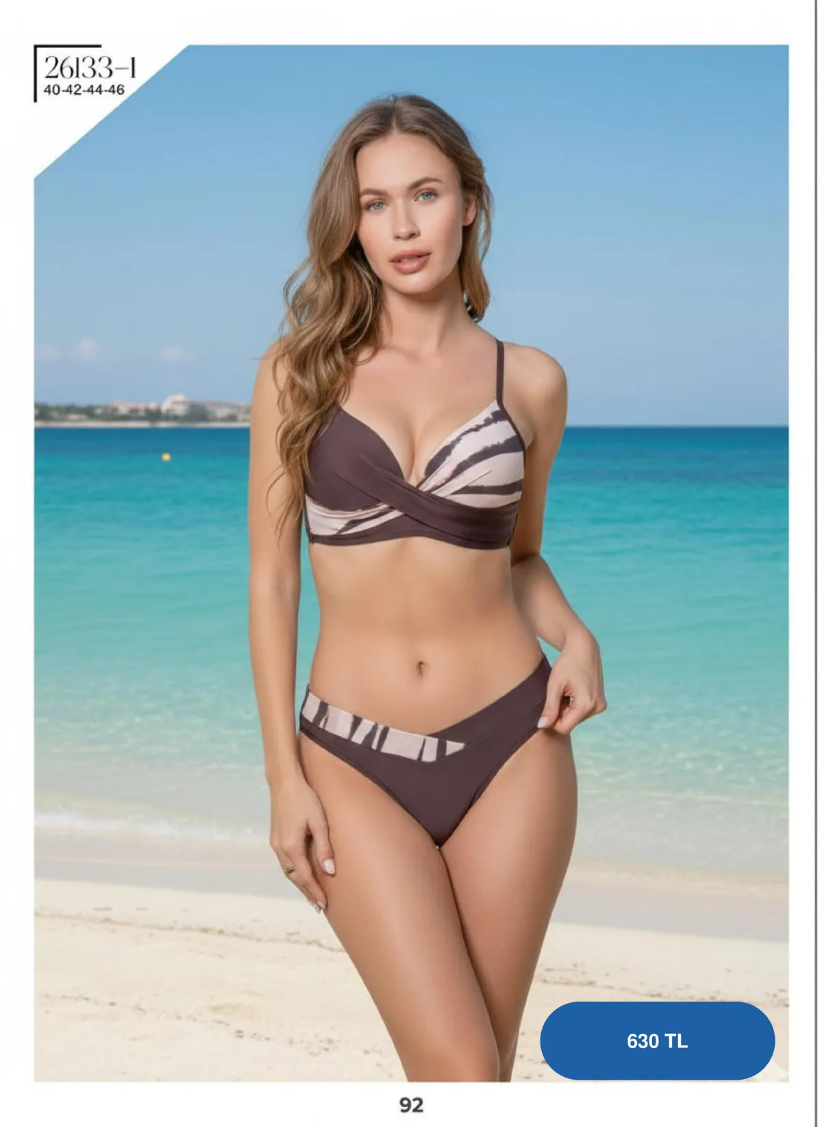 Plaj butiklerinize özel, kahverengi tonlarında, şerit desen detaylı ve V yaka tasarımlı toptan kadın bikini takımı. Toptan plaj giyim siparişleriniz için ideal.